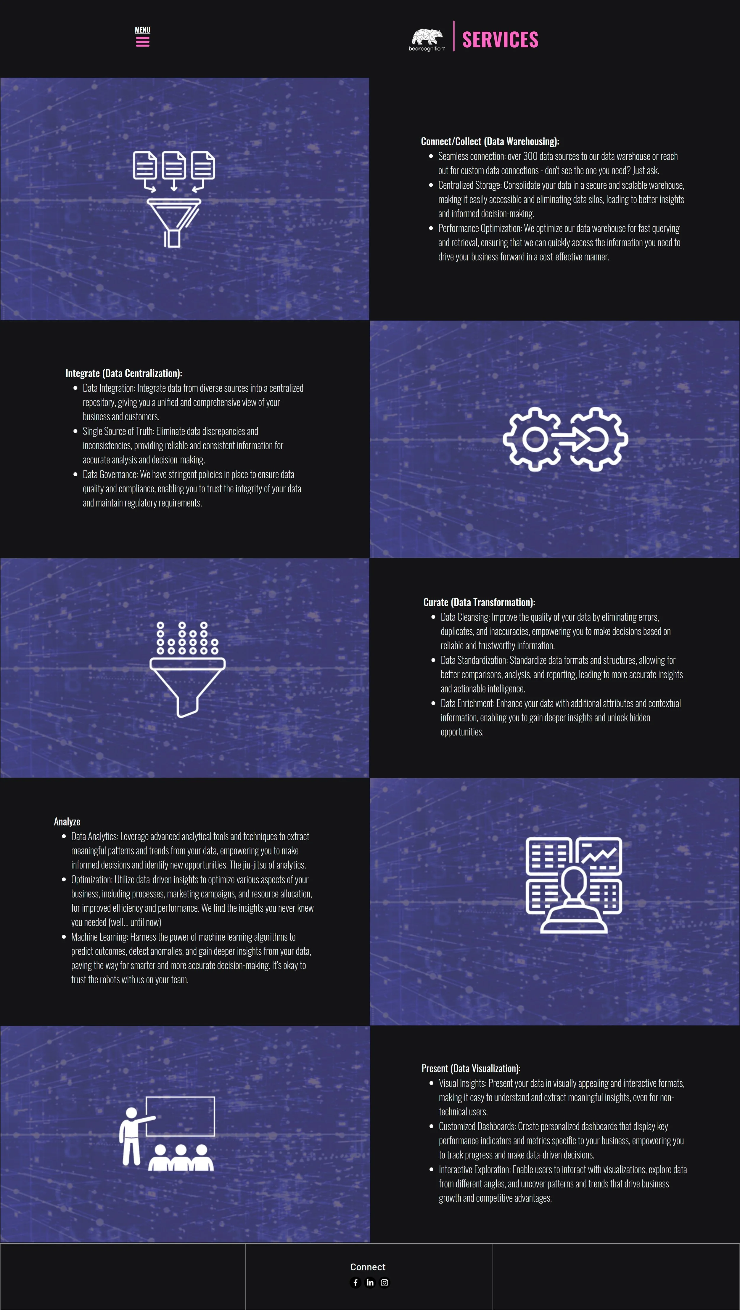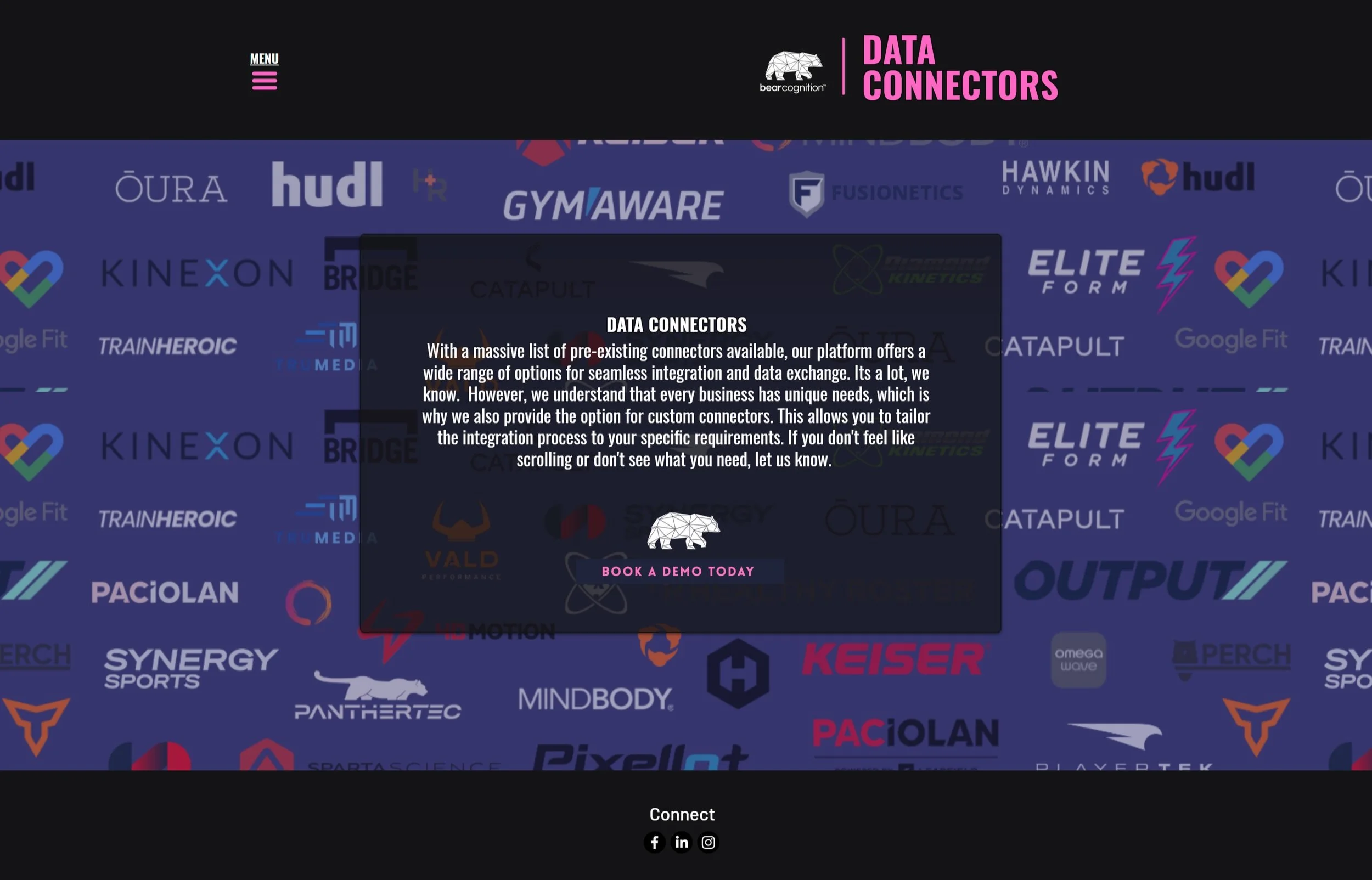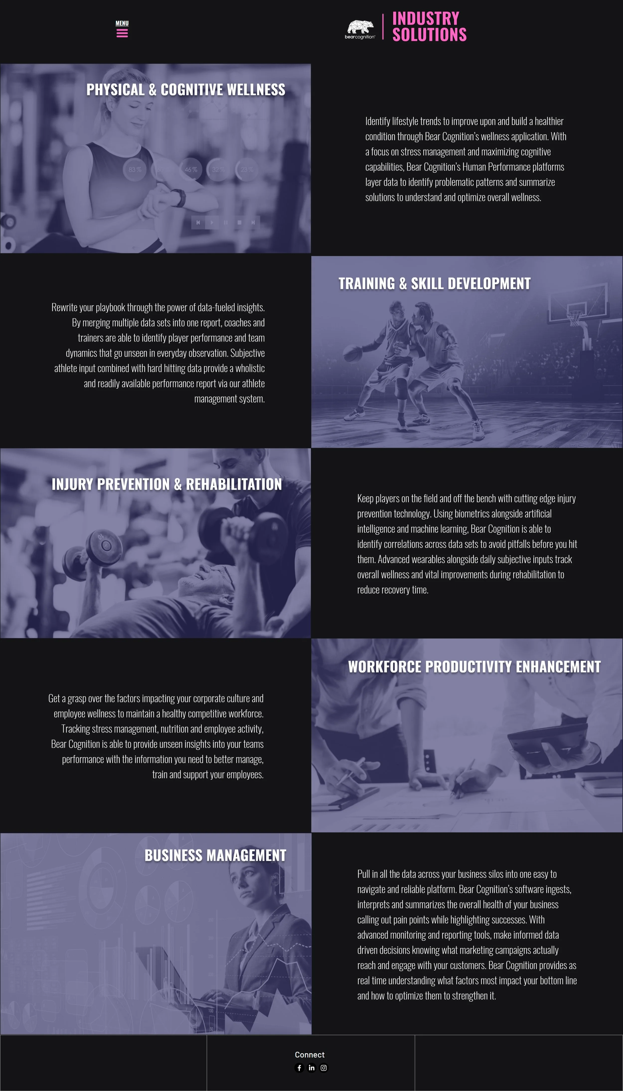 I designed a modern, highly visual website for Bear Cognition's Human Performance division, showcasing its data-driven approach to optimizing teams, athletes, and employees. The site highlights key metrics, proprietary technology, and AI-driven solutions. Clear navigation and cohesive visuals ensure an engaging user experience while effectively communicating the company’s expertise in performance analytics.