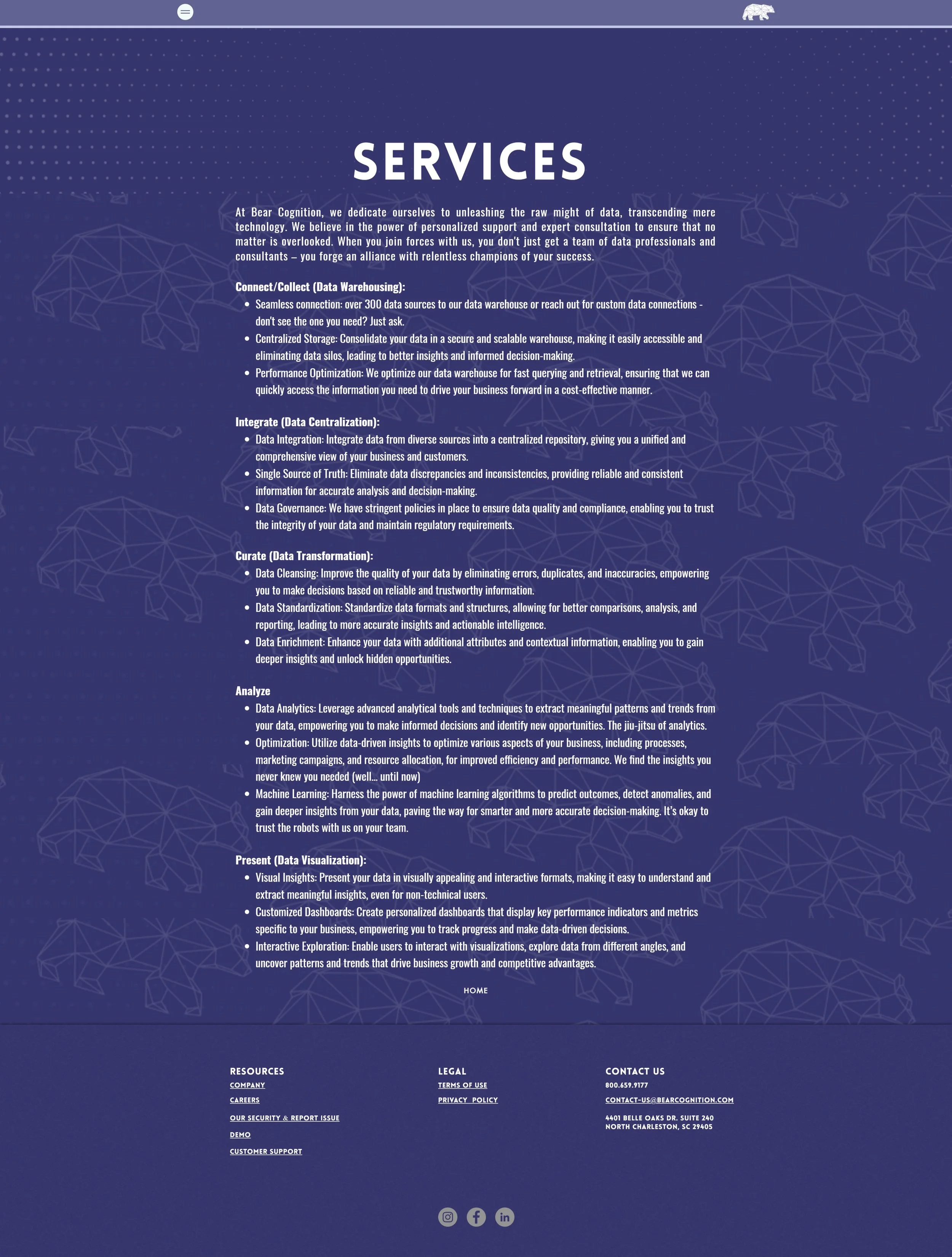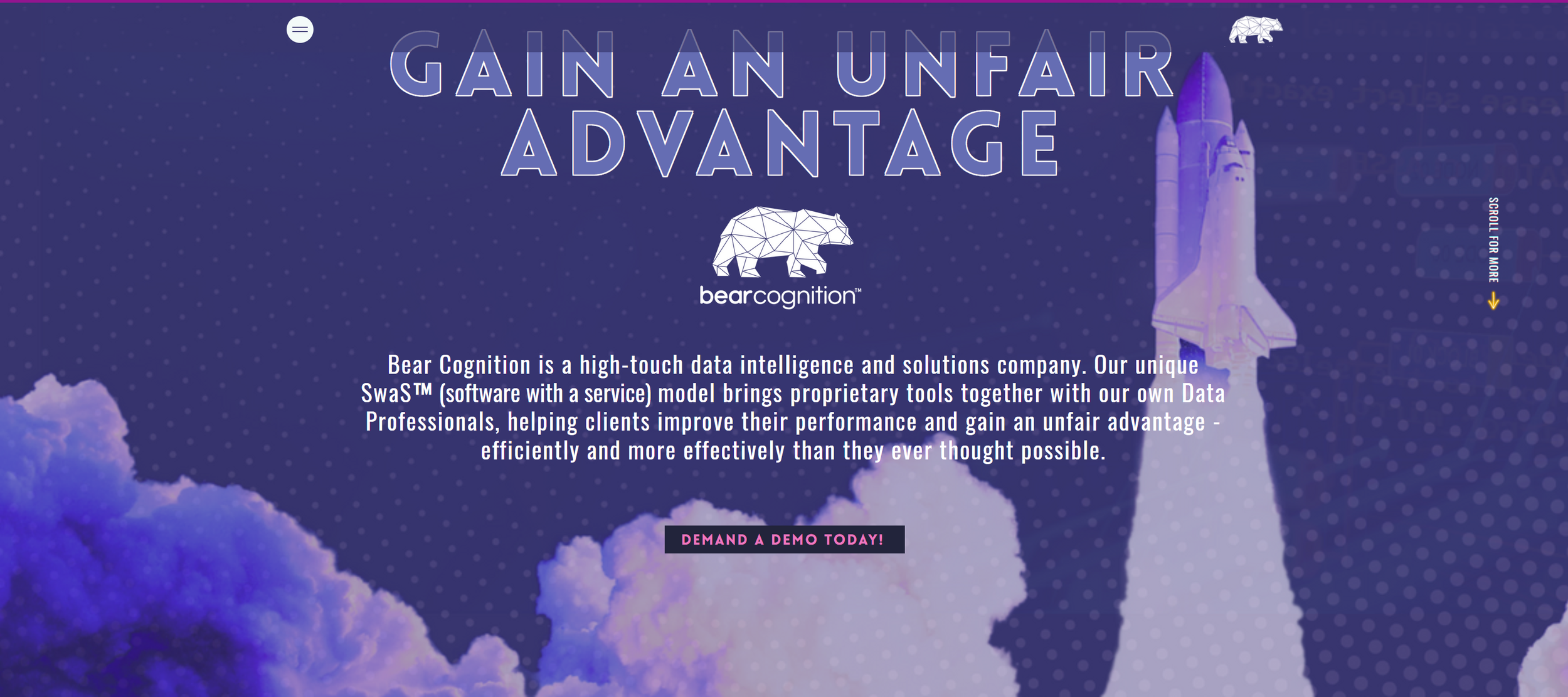Senior staff at Bear Cognition wanted a highly stylized website that showcased their unique approach to data analytics. I designed a bold, visually engaging site that highlights the company’s innovative SaaS model, blending proprietary tools with expert data professionals. The design balances a sleek, modern aesthetic with intuitive navigation, ensuring a seamless user experience. Through dynamic visuals, striking typography, and thoughtfully structured content, the site effectively communicates complex data solutions while reinforcing Bear Cognition’s cutting-edge identity.